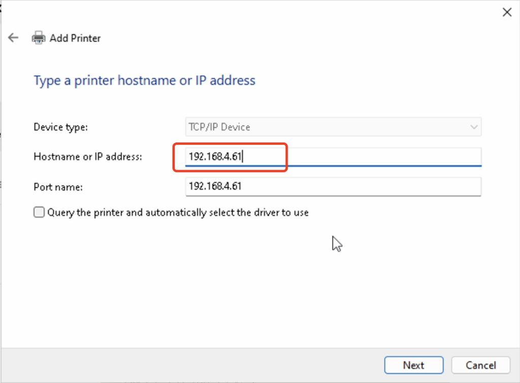 ③Uncheck “Query the printer and automatically select the driver to use,” and then click “Next.”