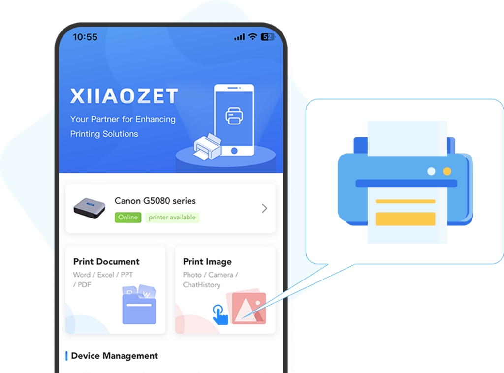 - Photo Printing: Supports printing from camera, phone gallery, and local images.