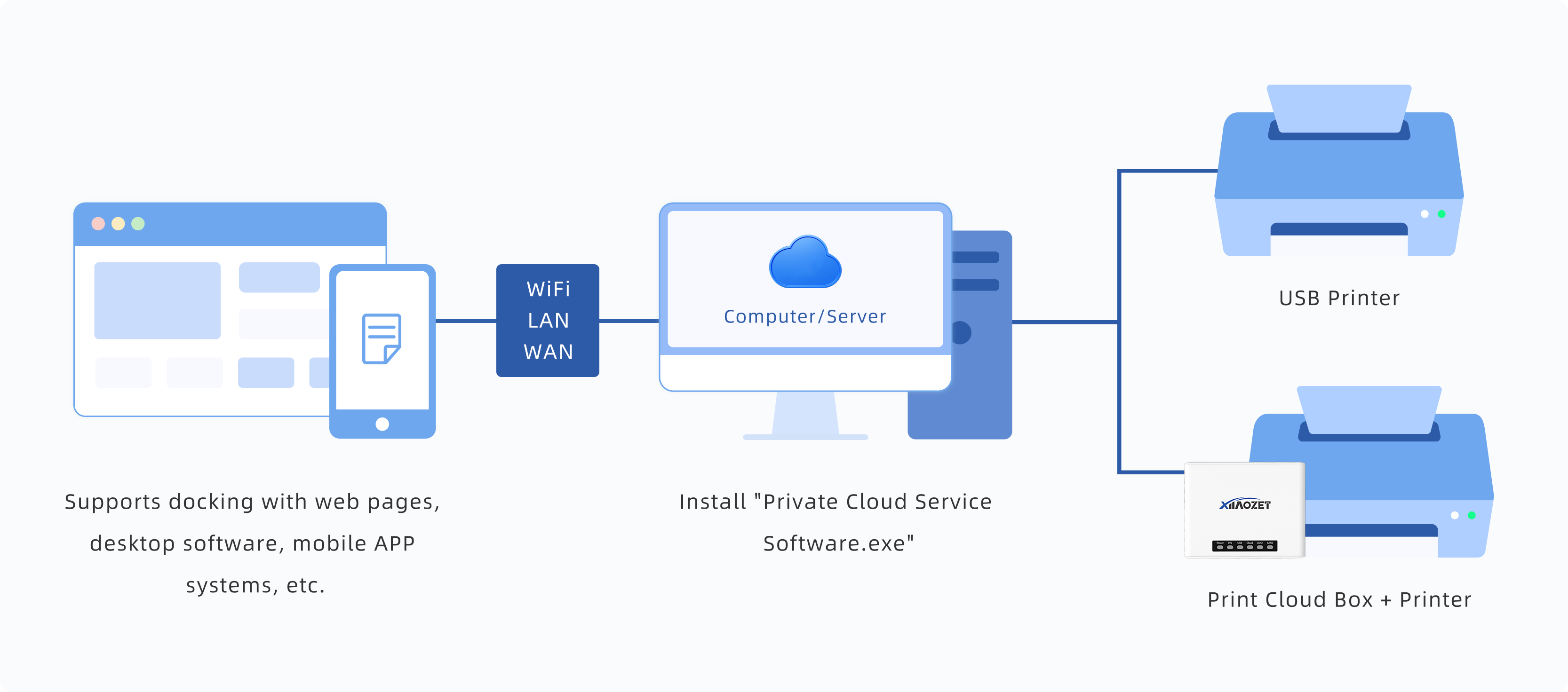 Supports deployment to local servers or dedicated cloud servers, providing a flexible computer-based API printing service tailored for business offices, educational institutions, warehouses, and shared printing environments.